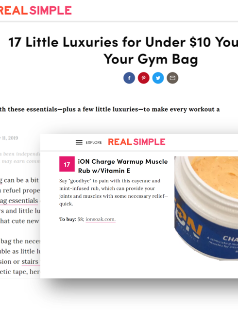 Real Simple Magazine noted iON CHARGE Rub as one of "17 Luxuries" for the Gym Bag!